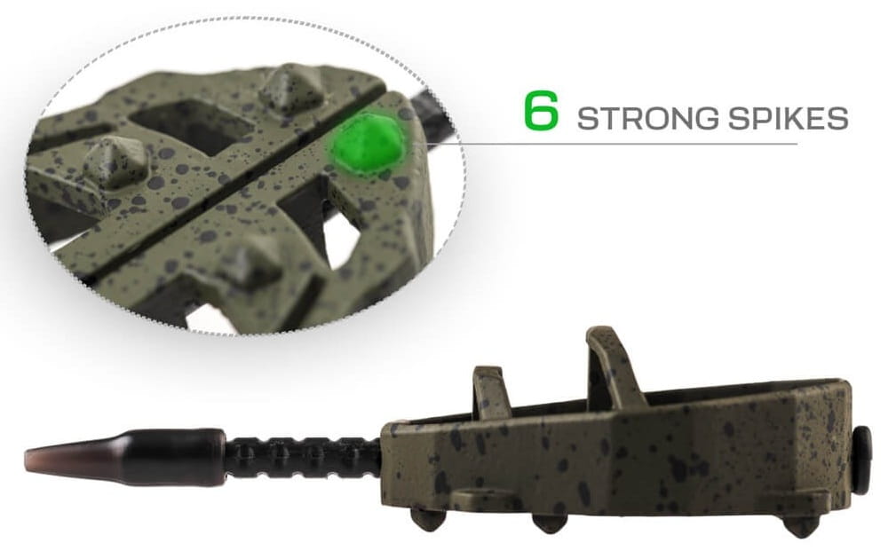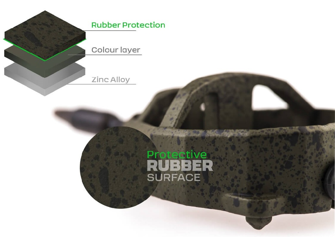 Koszyki wykonano z bezołowiowego materiału w matowym, gumowanym zielonym wykończeniu z czarnymi kropkami, co zapewnia doskonały kamuflaż na dnie. System szybkiej wymiany obciążenia pozwala zmienić gramaturę bez konieczności ponownego wiązania zestawu.