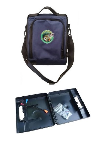 - Nieprzemakalna torba uszyta na miarę echosondy, która zabezpiecza nam ekran. Wewnątrz torby znajduje się specjalny pojemnik na akumulator wraz z okablowaniem, dzięki czemu nie będziesz musiał szukać specjalnych podłączeń. Wystarczy że przeciągniesz kabel zasilający urządzenia przez otwór z tyłu pojemnika i podłączysz go do pomarańczowej kostki elektrycznej ( kabel czarny z czarnym, czerwony z czerwonym). Akumulator wystarczy umieścić w pojemniku w wyznaczonym miejscu i podłączyć do niego kable wychodzące z kostki. Podstawkę ekranu należy przykręcić za pomocą dołączonych do zestawy śrub na pojemniku. Tak podłączone urządzenie umieszczamy w torbie. Aby nie kłopotać się za każdym razem z wyjmowaniem akumulatora do ładowania, do zestawu dołączyliśmy również specjalną przejściówkę do ładowarki za pomocą której bez wyjmowania pojemnika naładujesz akumulator. Teraz wystarczy że połączysz przejściówkę z ładowarką, a drugi koniec bezpośrednio do gniazda chinch na zewnętrznej stronie pudełka poprzez specjalny otwór na froncie torby. Torba pomieści wszystkie modele echosond do wielkości 7-cali. Posiada kieszenie na bokach oraz pasek do przenoszenia na ramieniu.